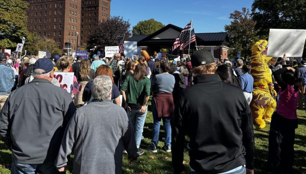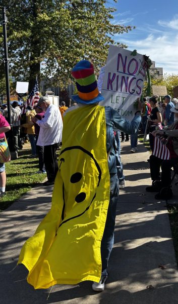 There were many protestors in costumes, like this purple dinosaur holding a sign that reads, “Don’t let democracy go extinct.” (Bailey Clements)